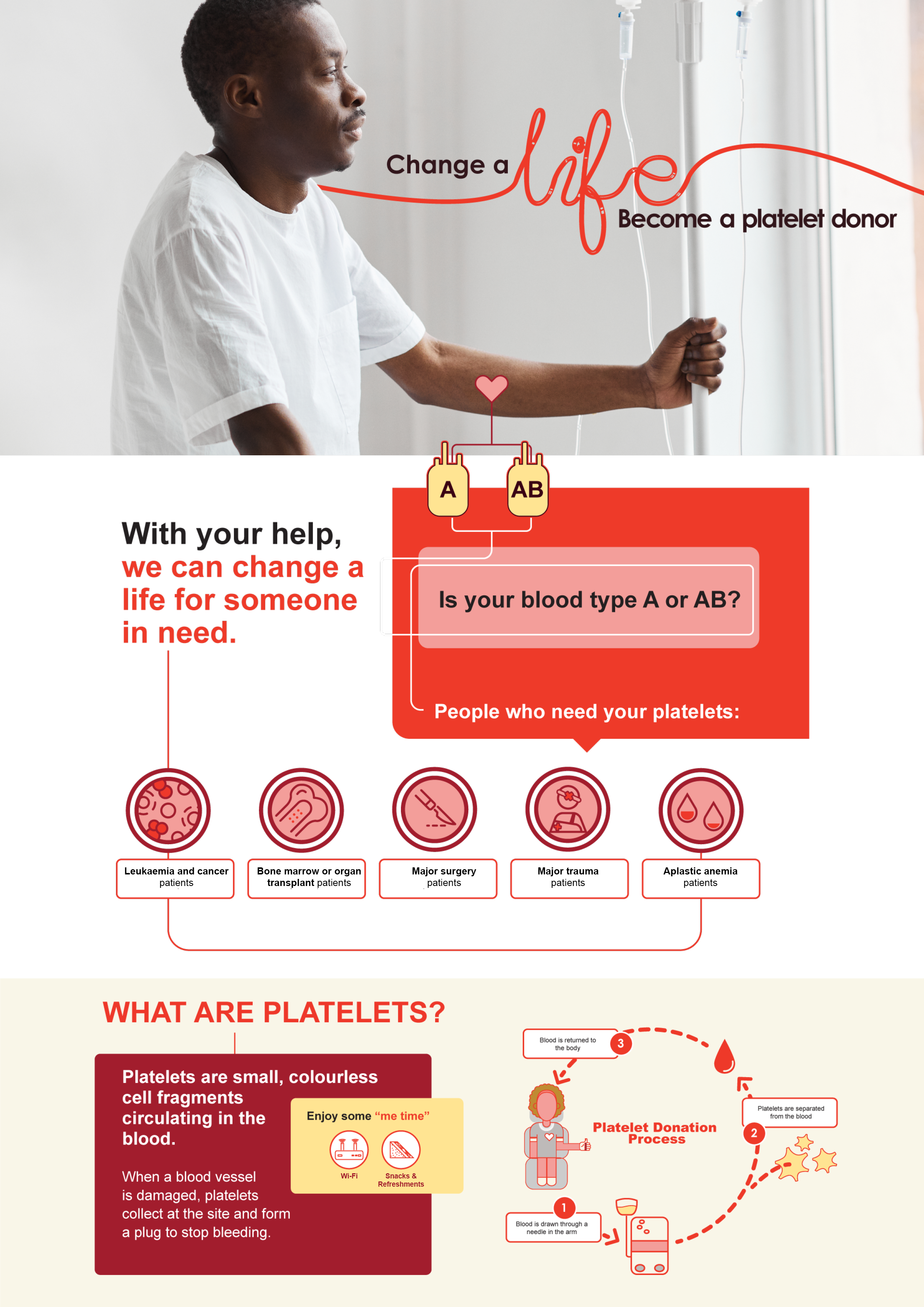 From start to finish, it takes about 90 minutes to donate platelets. It will take approximately 30 minutes to complete the health history questionnaire and for the machine to be personally set-up for you. From there you can expect to be donating for about one hour followed by enjoying a snack offered during donation. This is because it takes time to separate and collect the platelets from the other blood components. During the process, platelets are removed from your blood and other fluids are returned to you. During your donation you can relax, watch a movie, listen to music…in 90 minutes you’ll have donated enough platelets to help as many as three patients. Many donors say platelet donation is their ‘me time’ to unwind from the daily stresses of life while helping save lives.