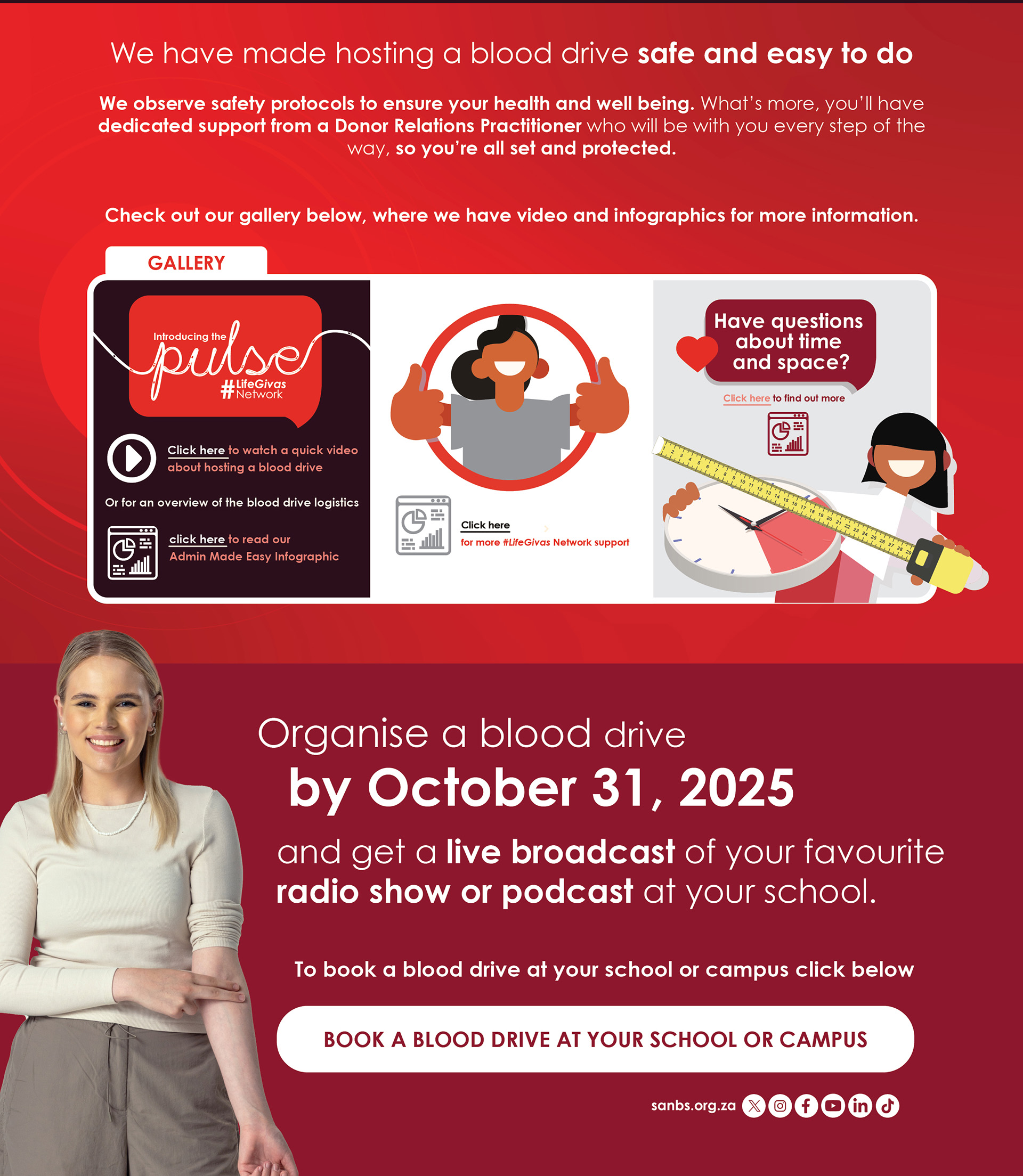 Help SANBS recruit new blood donors by organising a blood drive in your community,